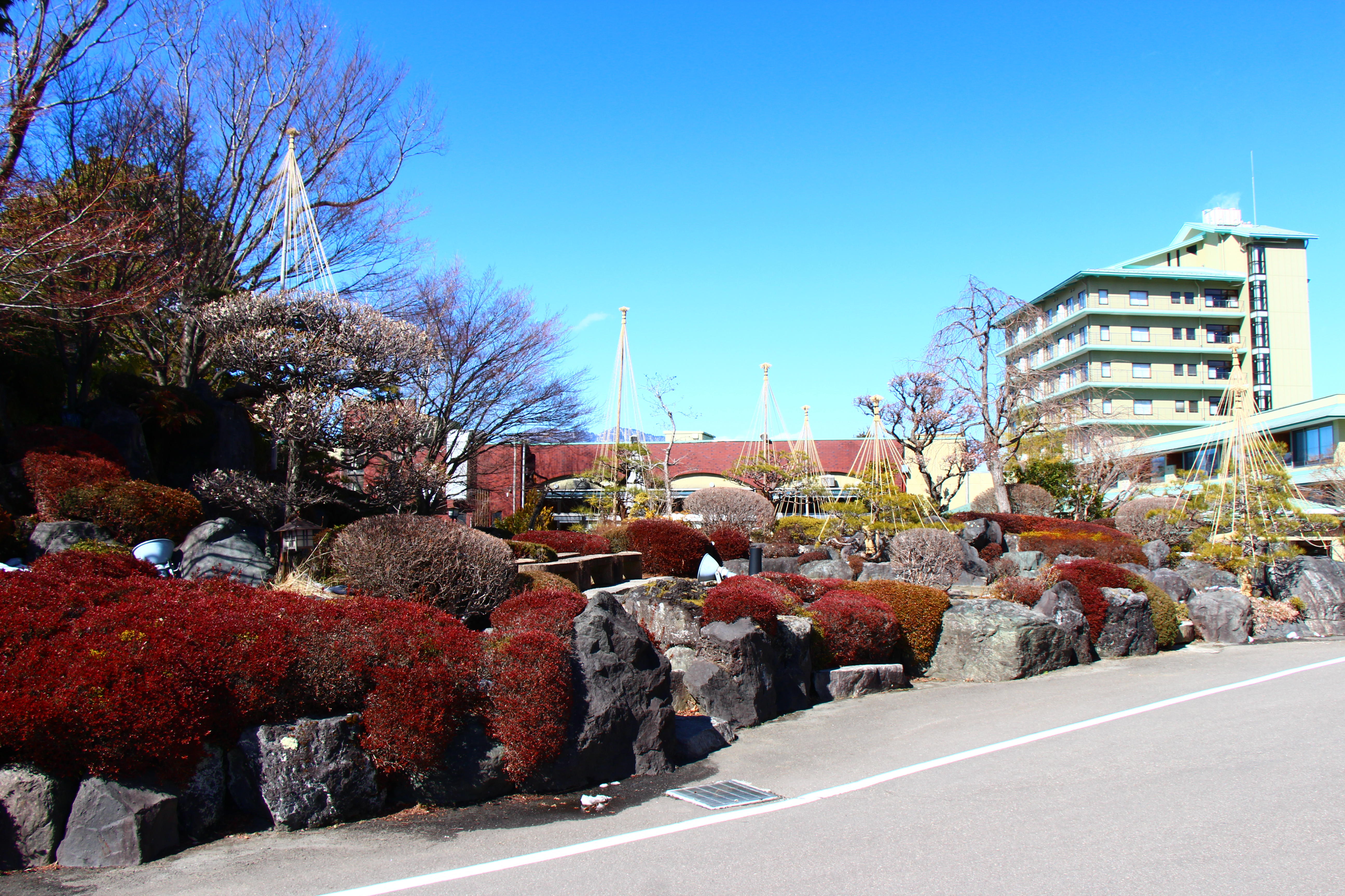 例年に比べると降雪が多く庭園も少しだけ雪化粧をしており