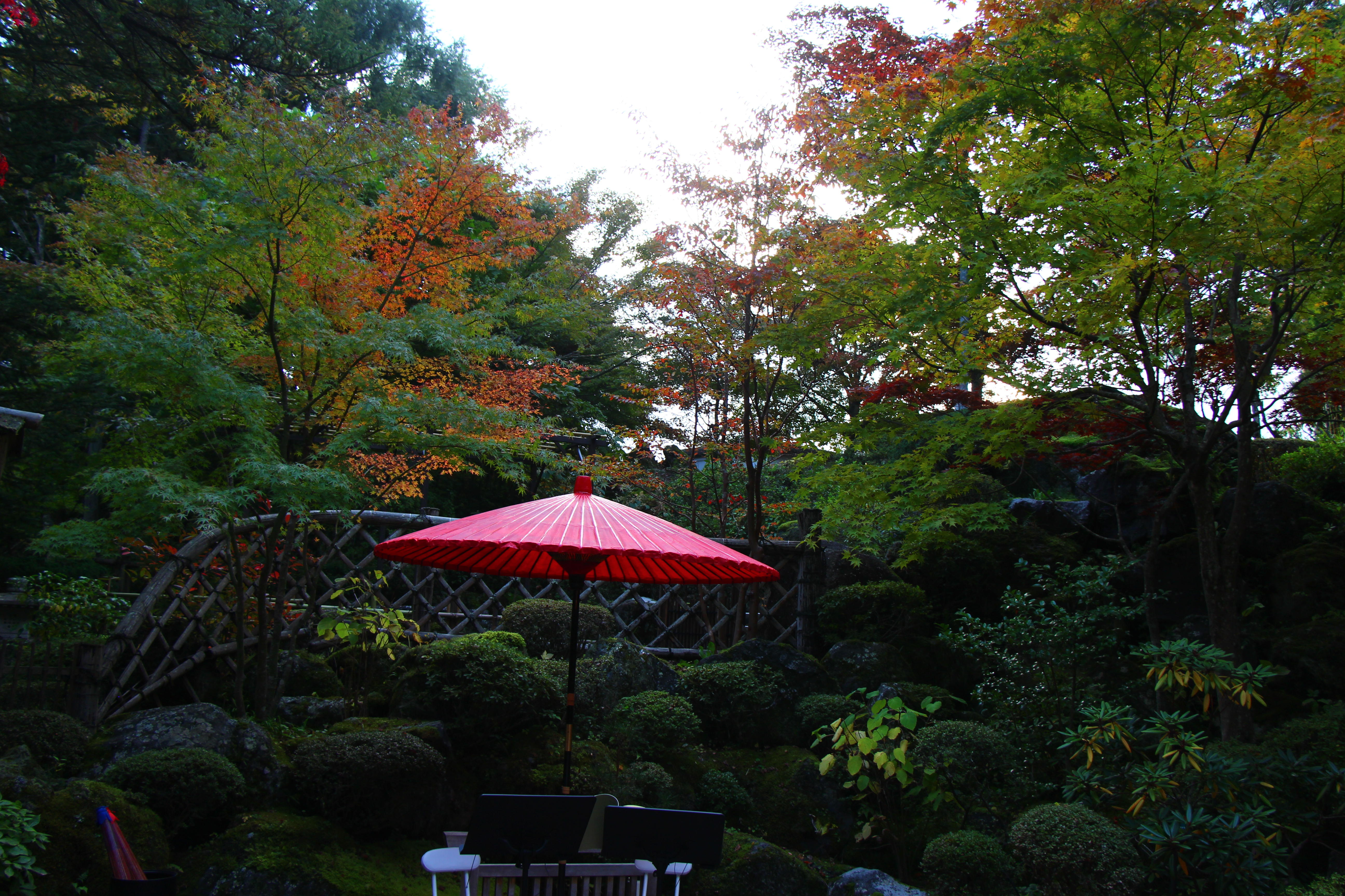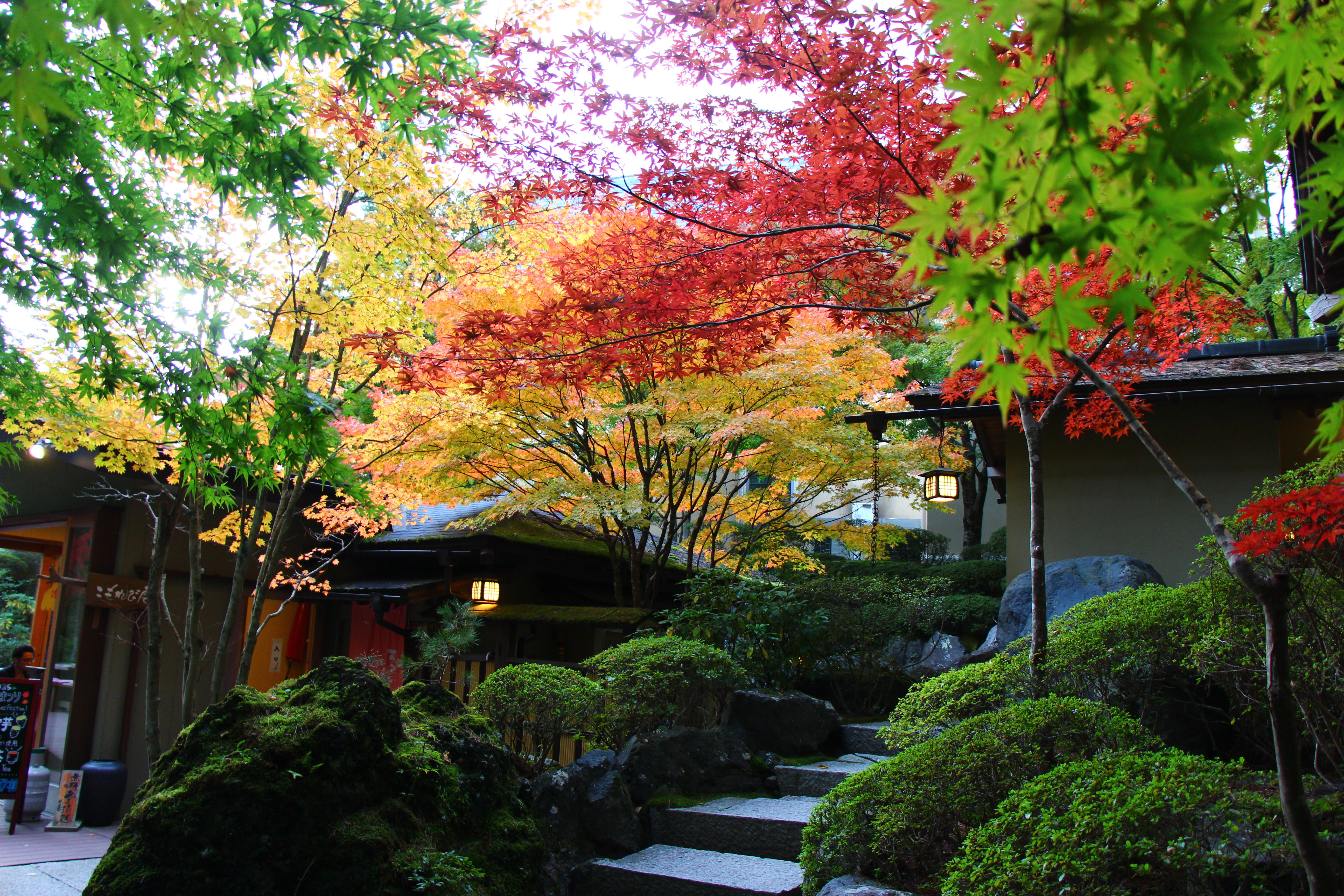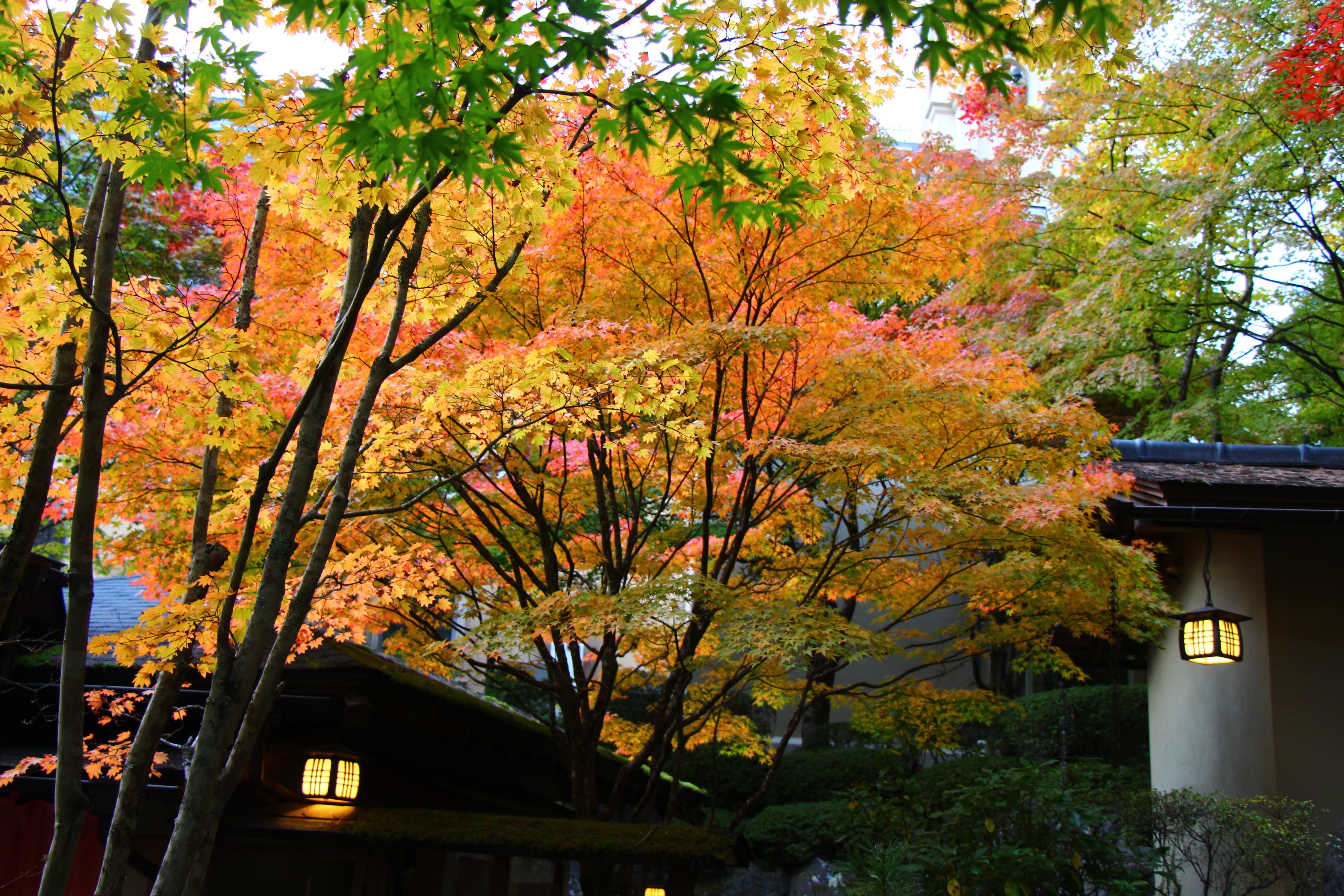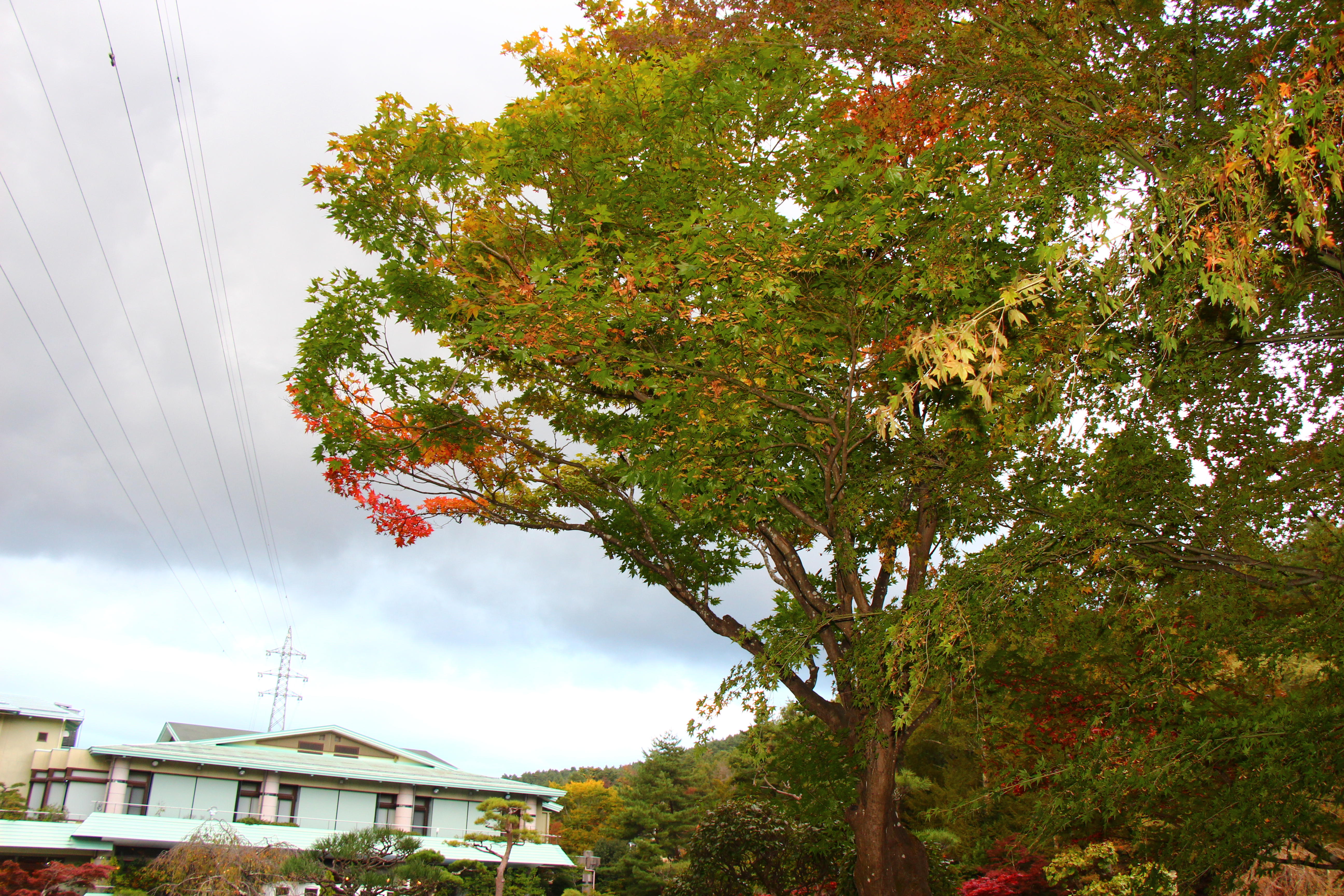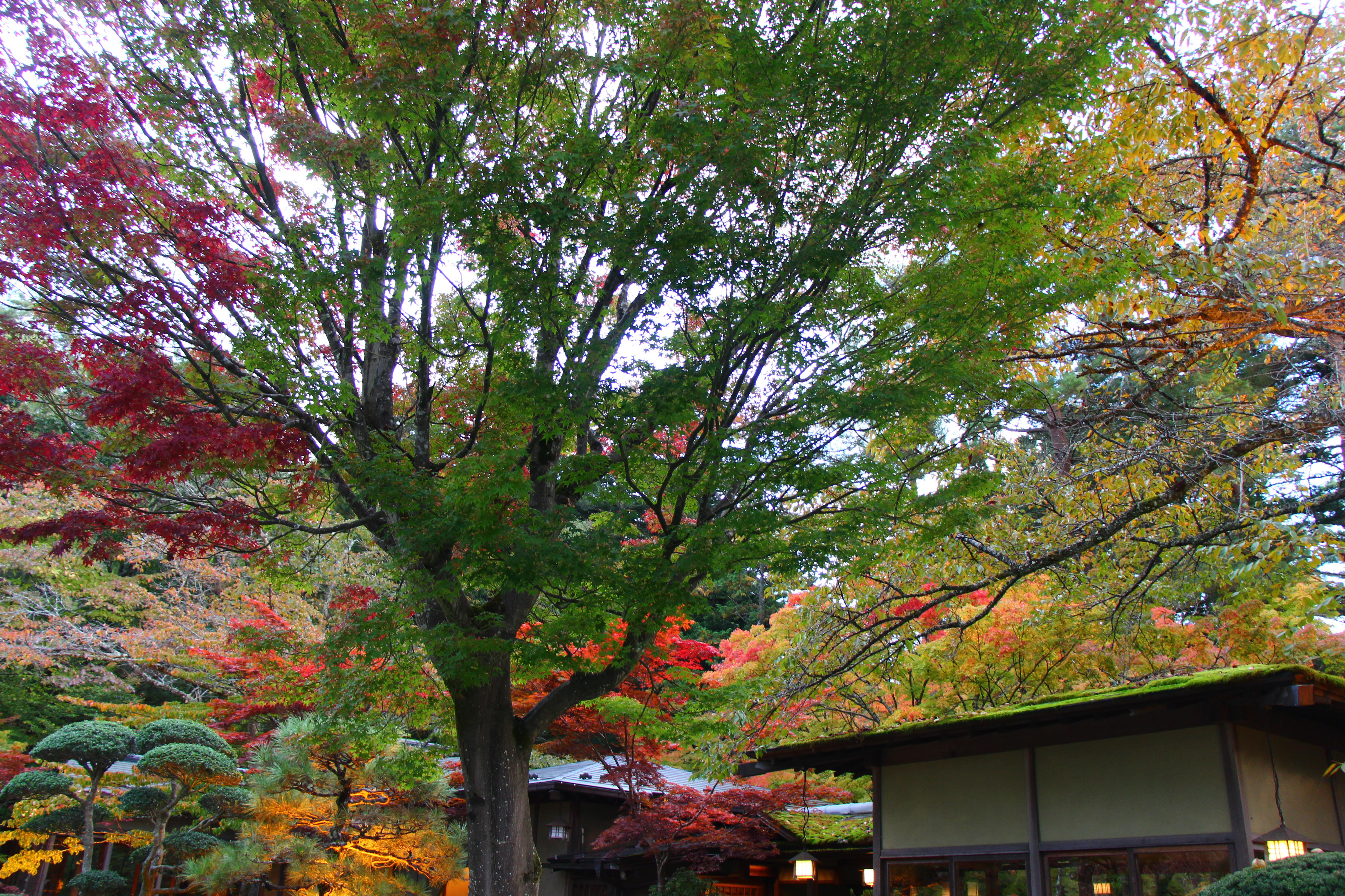 庭園の紅葉は少しずつ色づきを増しており特に焼き芋を提供しているこもれび庵の側に一際紅葉の進んだ木がございます