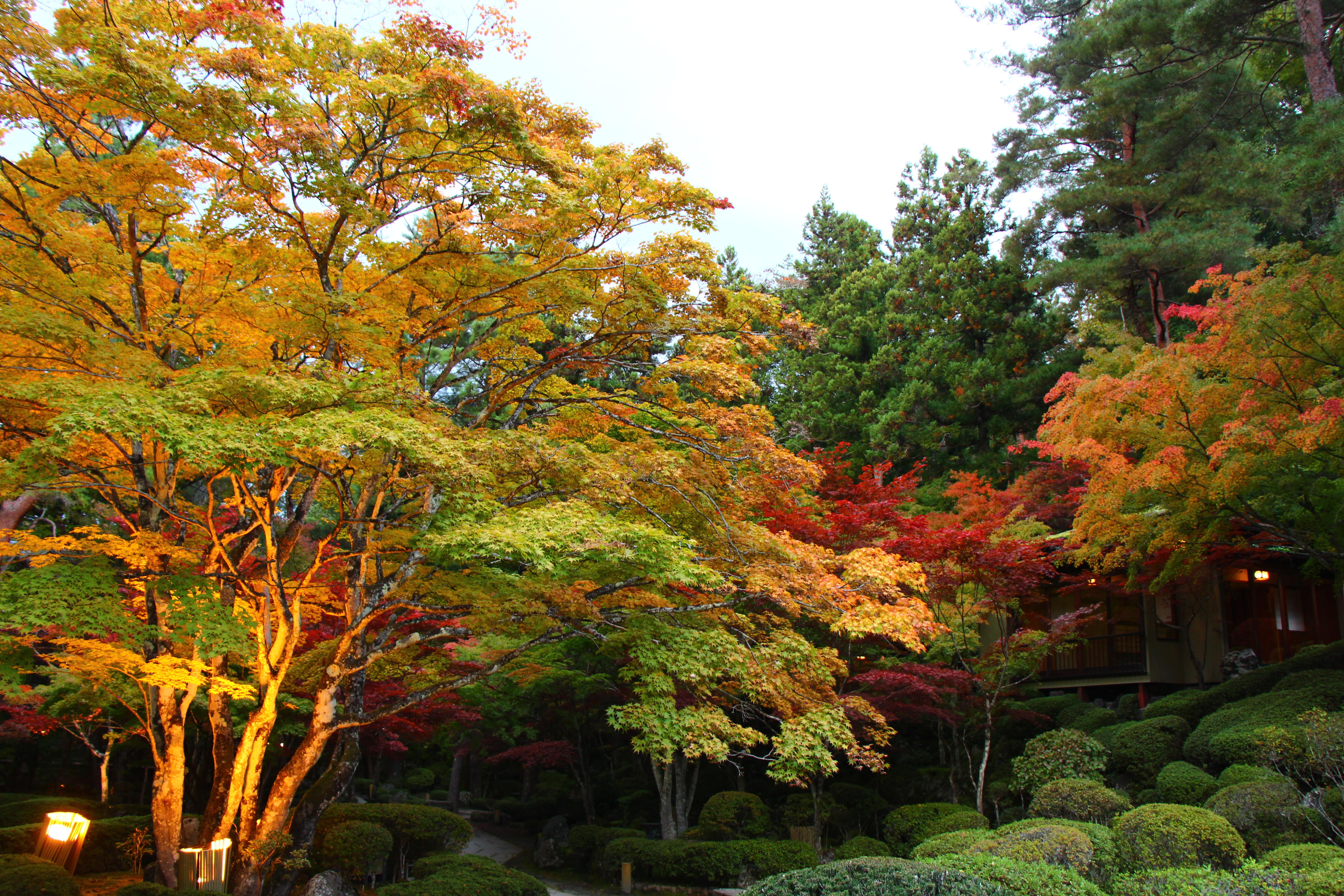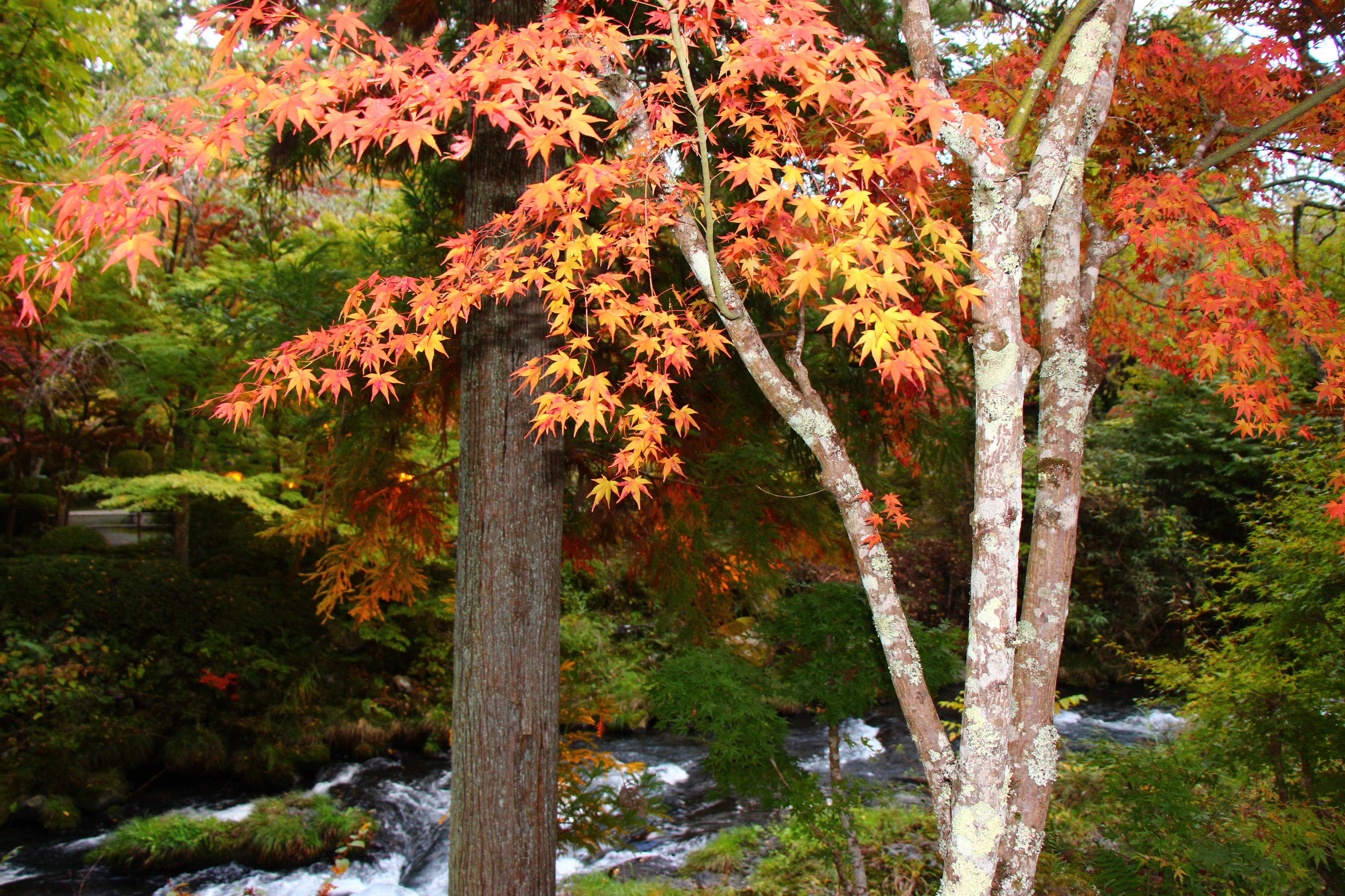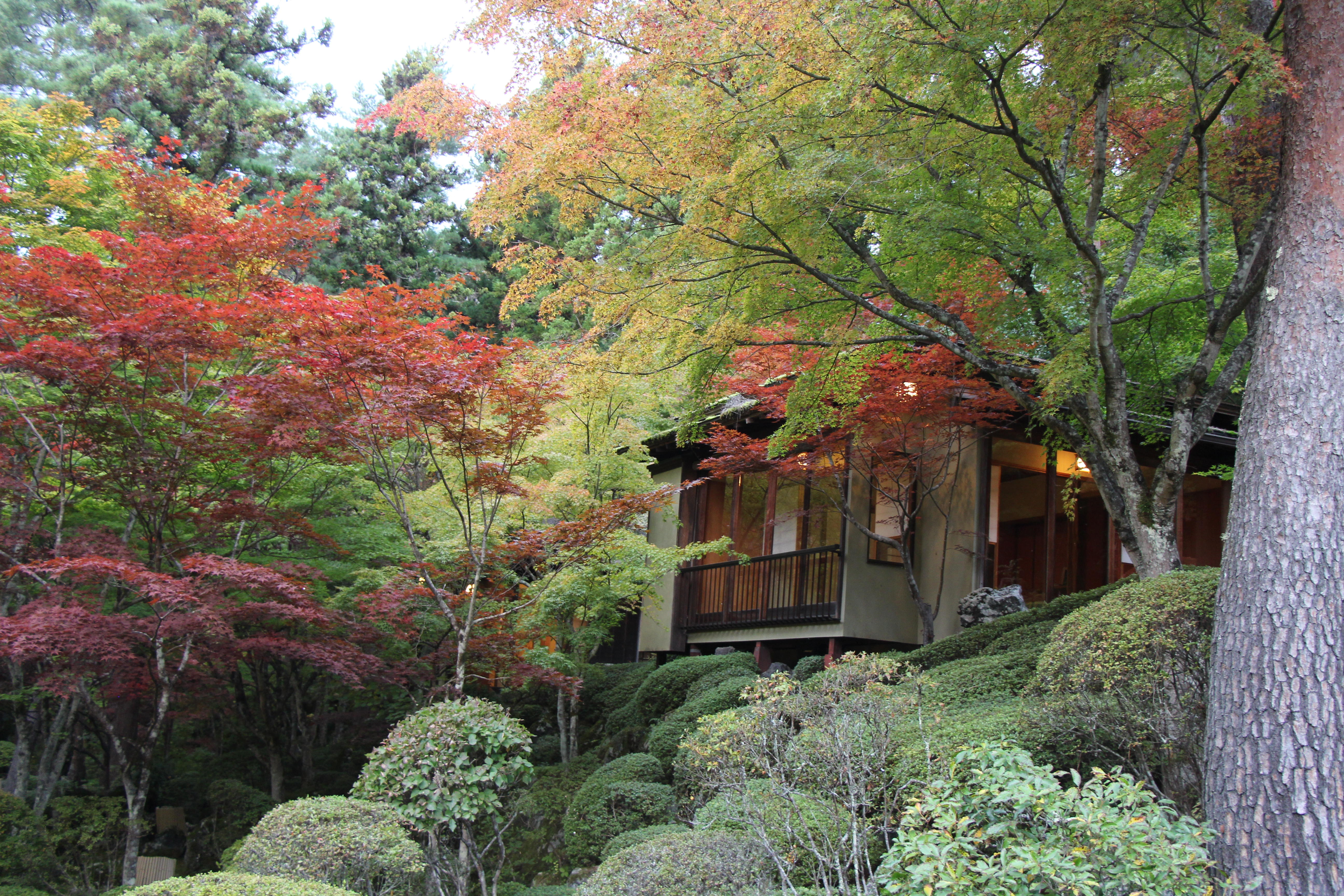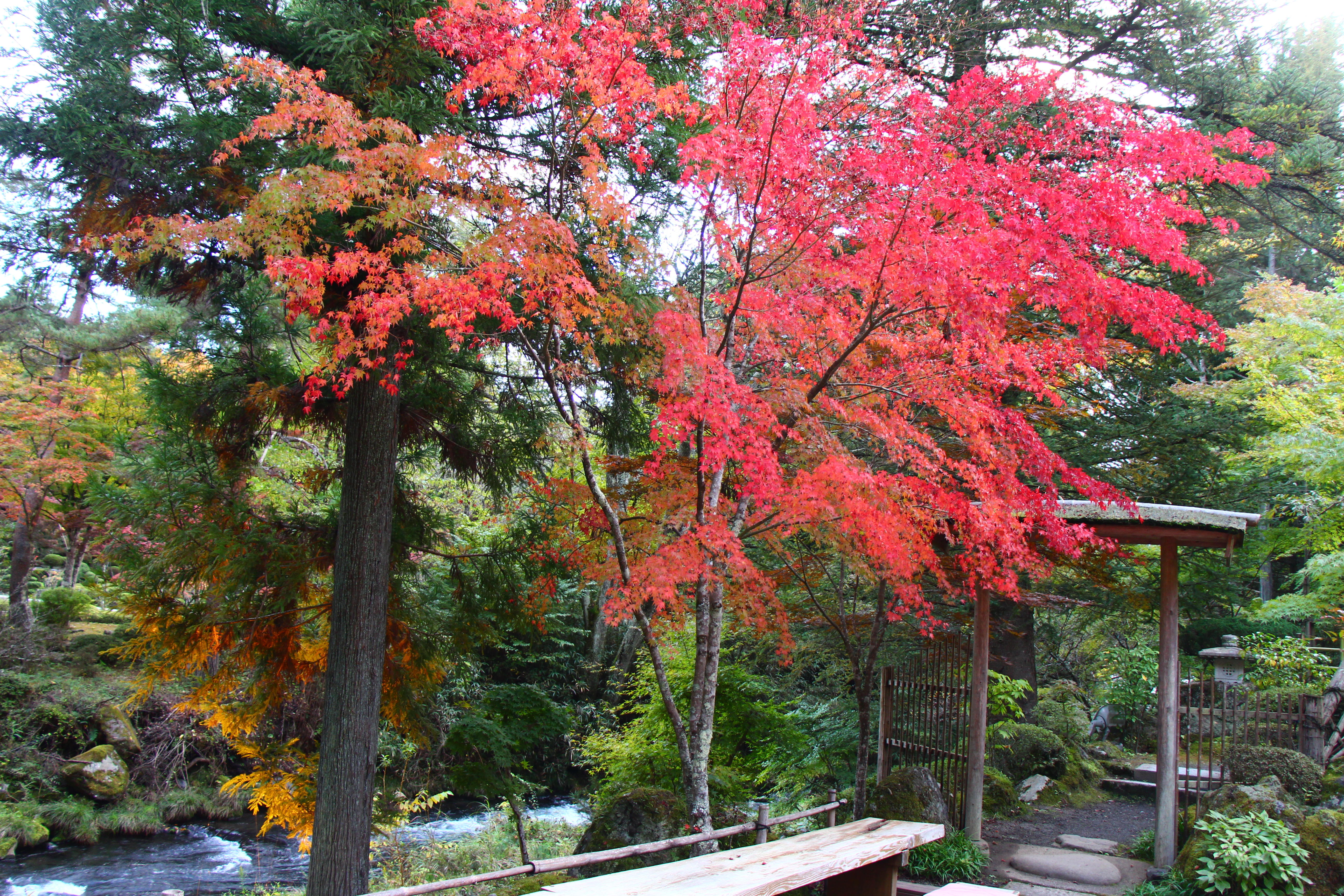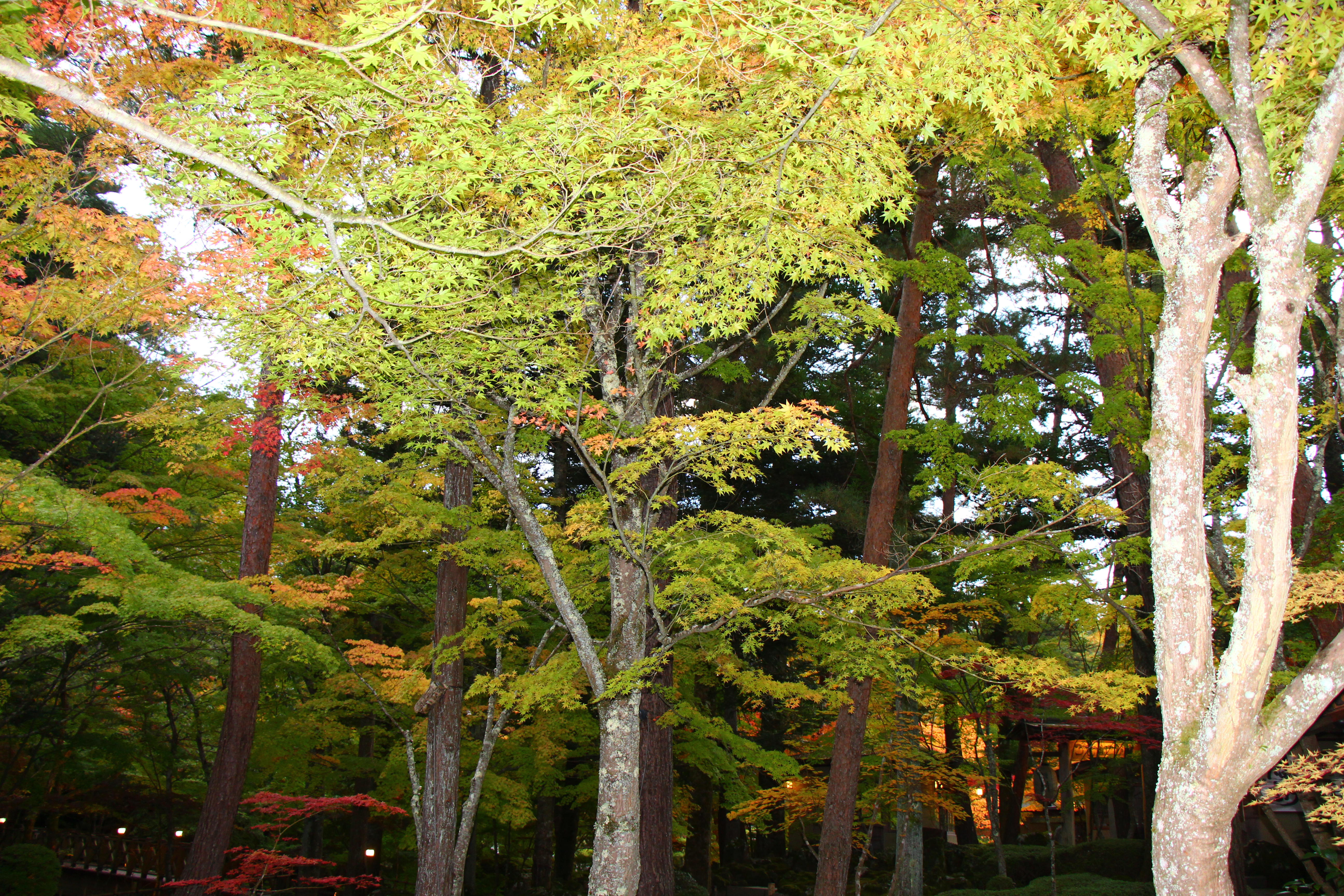 庭園の紅葉は少しずつ色づきを増しており特に焼き芋を提供しているこもれび庵の側に一際紅葉の進んだ木がございます