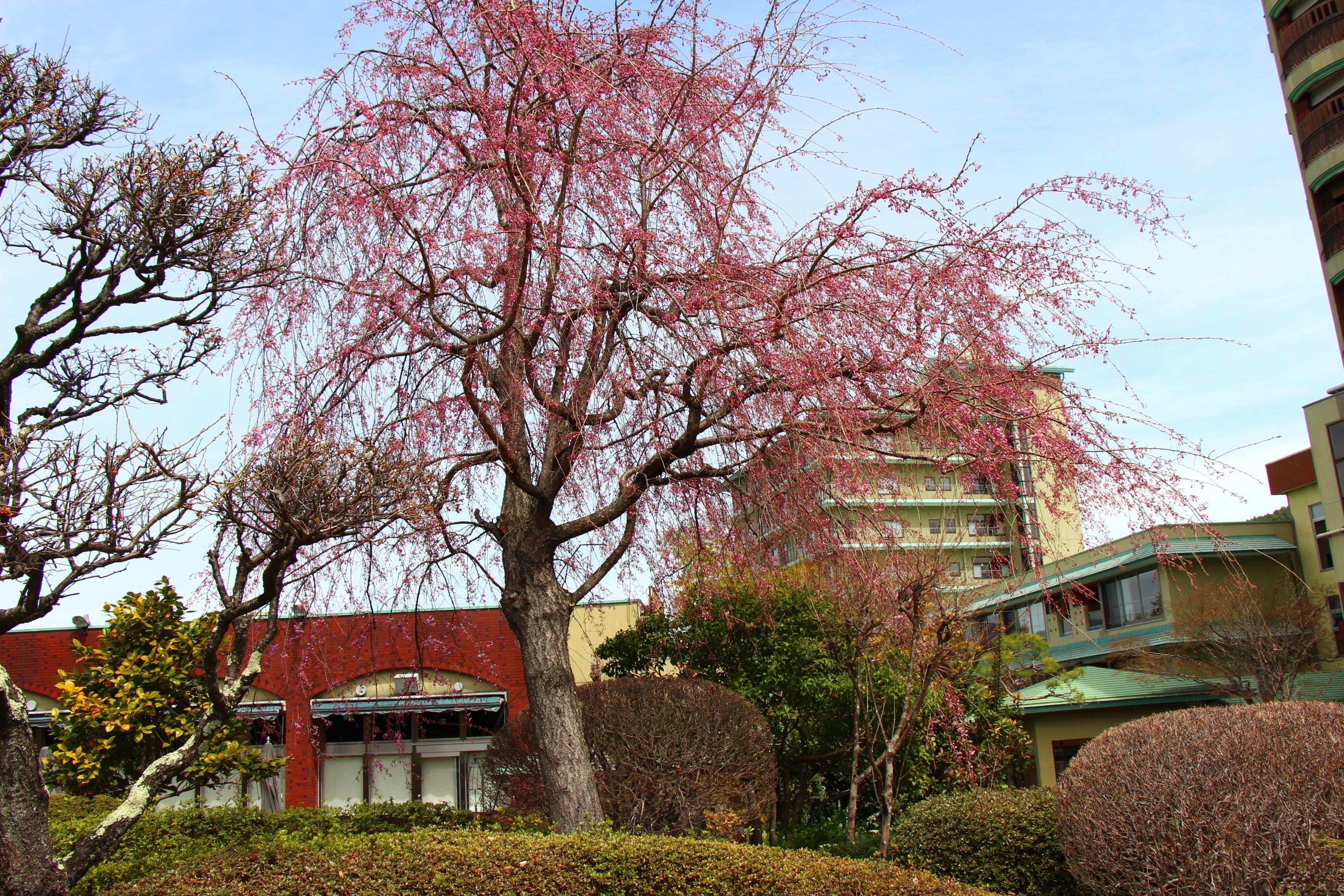 奥庭や、フロント前のシダレザクラも咲き始め