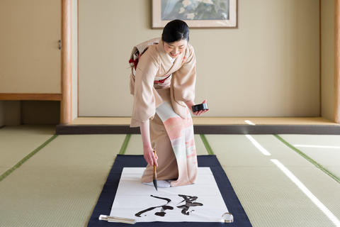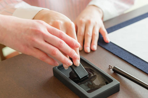 インストラクターから、書道の心得、歴史、書き方等をご案内。墨を磨りながら精神統一し、書の世界に没入していただきます。