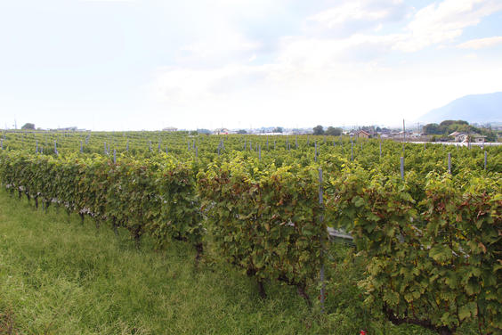 また周辺のぶどう畑は、緩やかな傾斜地に広がっています。扇状地の特徴でもある、 水はけの良さと、ブドウの樹の根が地下深く張るのに適した土壌硬度を持っていることから、様々な品種を栽培。周囲の山々により台風被害から守られつつ、寒暖差等の気候にも恵まれている為、日本の中でも特にぶどう栽培に適した土壌条件を持っていると言えるのかもしれません。