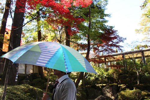 背景の紅葉も綺麗ですが、傘の柄にもご注目ください(笑)。