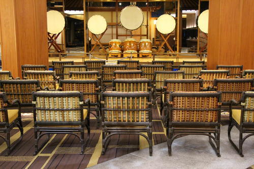 本日は太鼓部の合同練習の日で、普段は庭園で太鼓を叩いているのですが、本日は浮き舞台まで太鼓を運んで室内での練習。