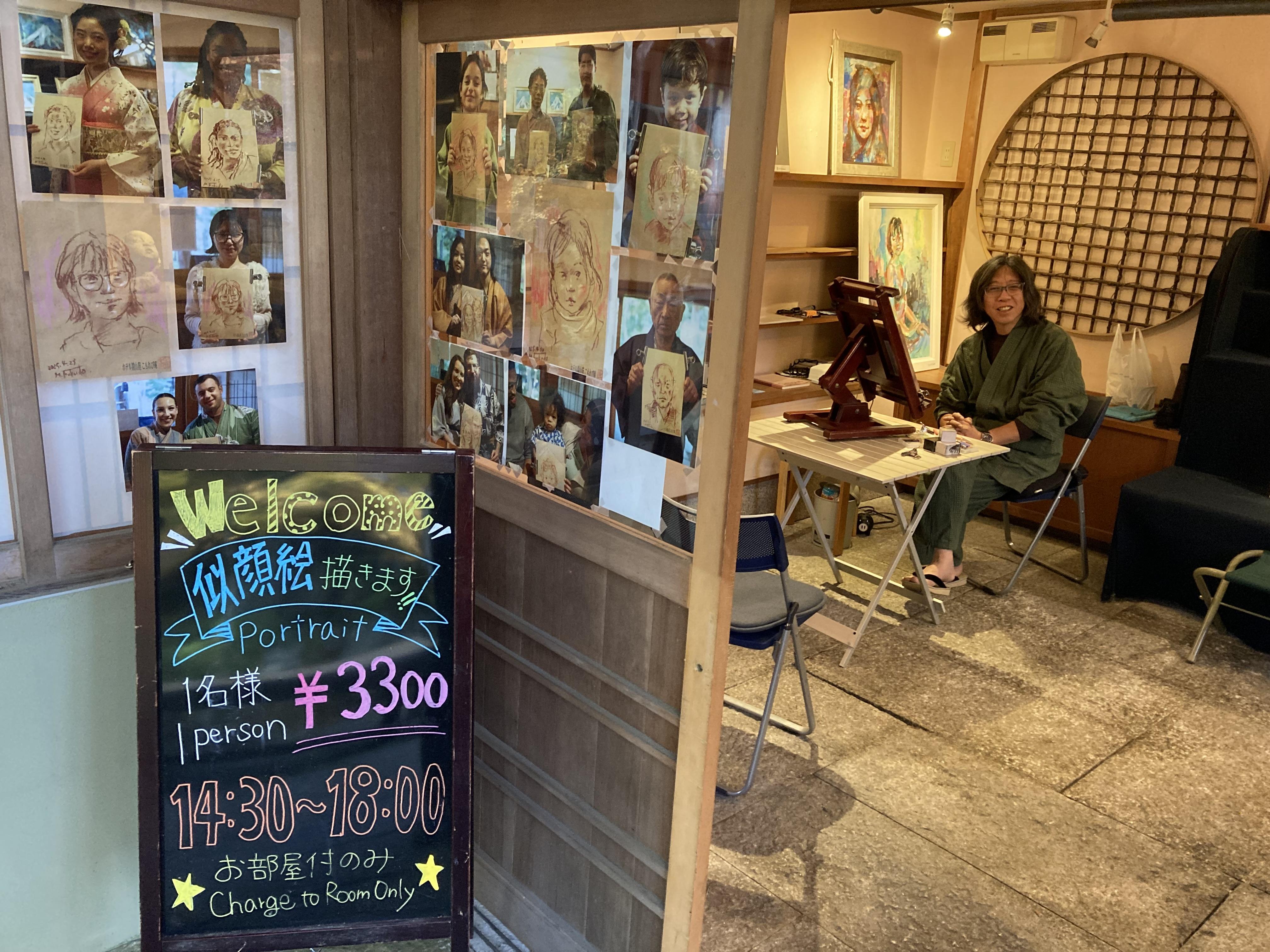 さて、そんな庭園のこもれび庵では焼き芋や甘酒の他に以前にもご紹介した似顔絵コーナーもあるのですが、ここ1週間程銀座で個展を開いていたため留守にしていた画家の福田さんが本日無事個展を終えて帰ってきました\(^^)/