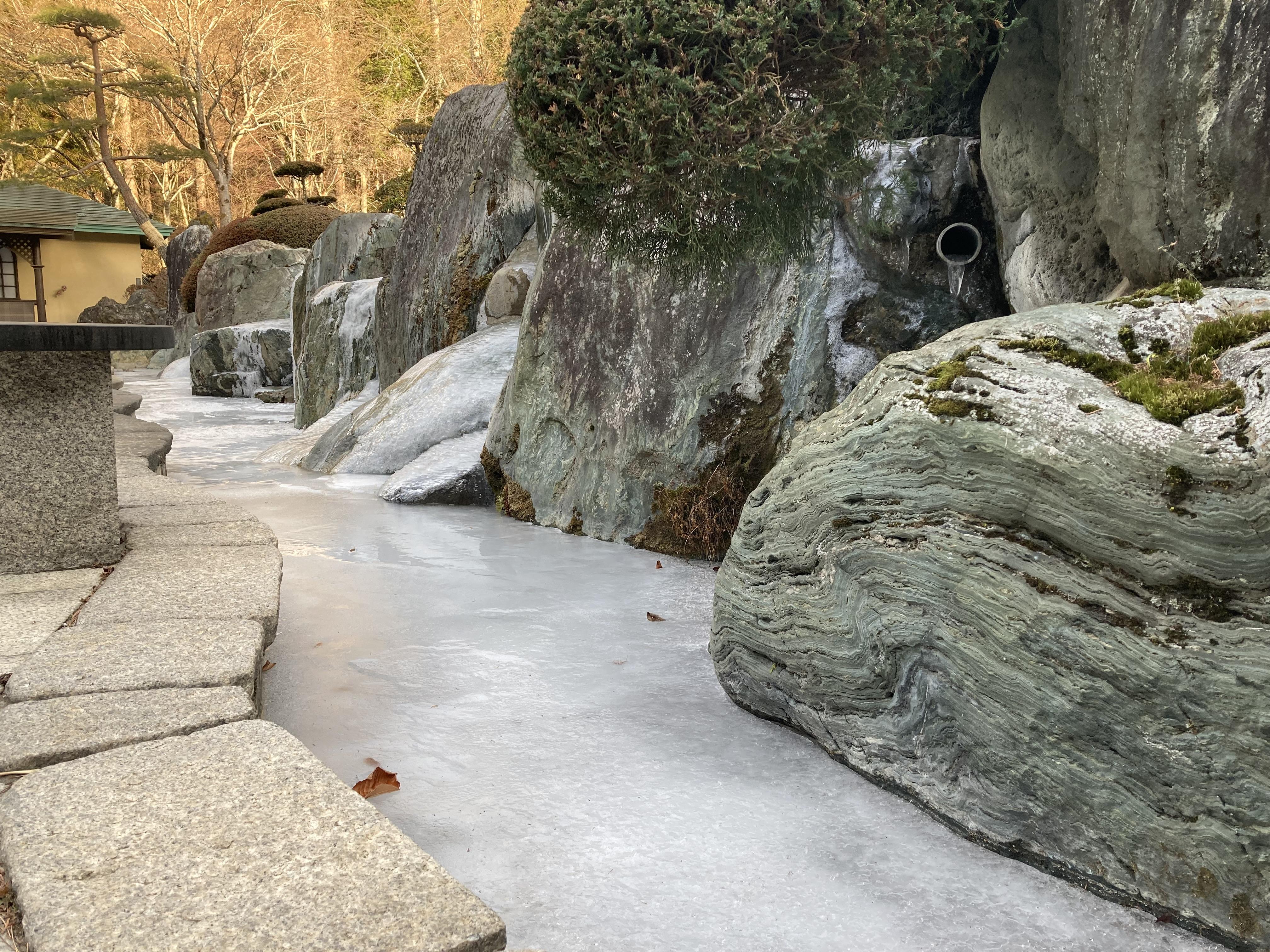 昨日は、山中湖よりは標高が低い場所となる当館のプールサイドにある滝&池も凍ってしまいましたー⇩。