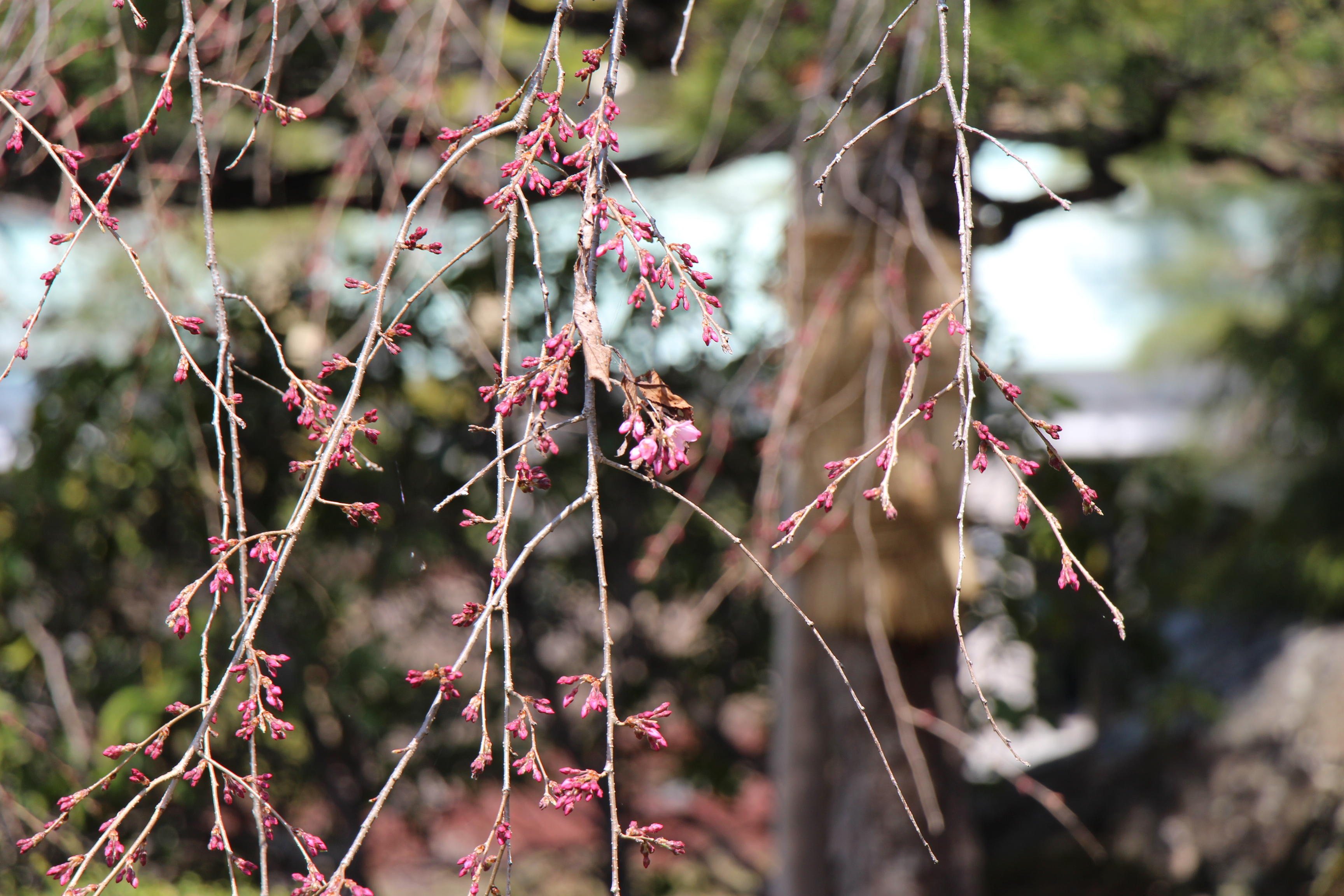 な、なんと!!当館庭園内、お茶室前にあるしだれ桜がわずかに開花していることを確認しました ٩(*´꒳`*)۶