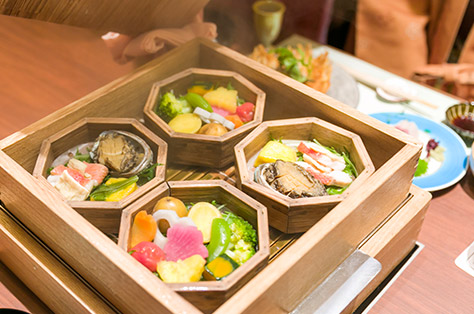 ถ้าให้พูดผมคงบอกว่าผมชอบจานซาชิมิมากที่สุด เพราะซาชิมิจัดอยู่ในจานที่มีลวดลายดั่งพิพิธภัณธ์สัตว์น้ำเล็ก และผักนึ่งตามฤดูกาล นอกจากทำให้รู้สึกว่ามันน่าอร่อยแล้ว ยังทำให้ผมประทับใจอีกมาก หลังจากนั้นพวกเรานั่งลงเตรียมพร้อมทานอาหาร และพนักงานเสิร์ฟเริ่มจุดไฟอุ่นให้ และเธอก็เปิดฝาภาชนะอาหารออก